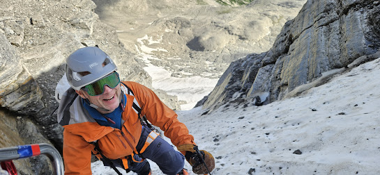 Pete kicked himself a platform below the prominent rock feature in the gully and I went out to test whether we'd be good soloing. Just as I was out 8 metres and realized that it was thin wet snow on ice the sun hit the top of the couloir and a bit of a sluff hit me head on. Not really a threat to knock me off however it did keep it real. I built a screw/ice tool anchor and threw a rope down to Pete, he then passed me for another 8 to 10 metres and put in his screw and belayed me up. We did this 2 more times playing leapfrog before returning to good snow and I built the final anchor in the ice on the right next to rock. After bringing up Pete we then ditched the rope and soloed to the top.
